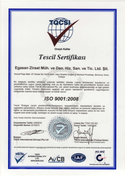 Fümigasyon, Zirai Mücadele, Hayvancılık, Peyzaj, Proje – Fizibilite, Zirai Danışmanlık, Eurepgap Danışmanlığı, Organik Tarım Danışmanlığı, Çevre Danışmanlığı, Kalite Sistemleri Danışmanlığı, Gıda Güvenliği Danışmanlığı gibi faaliyet dallarında Uzman Mühendis Kadrolarıyla Kaliteli Hizmet veren EGASAN ZİRAAT, verdiği tüm hizmetleri ISO 9001 yeterliliği ile Kalite Güvencesi altına almıştır. Bu bağlamda, firmaların kalite alt yapısını oluşturmasına yardımcı olurken, müşterisi olan çalıştığı firmalarda ücretsiz eğitimler, denetimler düzenleyerek çalışanların bilinçlenmesi ve işletmelerin kalite alt yapılarının gelişmesi konusunda da önemli bir değer yaratmaktadır.