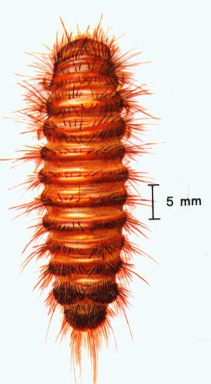 Erginler kırmızımsı kahverengi ve oval şekillidir. Vücut üzerinde açık renkli enine bantlar ve kıllar bulunur. Ergin dişi 2.5 mm. erkek 1.8 mm. boyundadır. Yumurtaları saydam – beyaz renklerdedir. Larvaları yaşına göre 0.5 – 5.5 mm. boyda, halkalı bir görünüşe sahiptir. Vücut çok sert esmer kıllarla kaplıdır. Vücut sonunda uzun bir kıl demeti bulunur. Pupa soluk esmer renkli, sırtı hariç diğer bölümleri tüylerle kaplıdır.