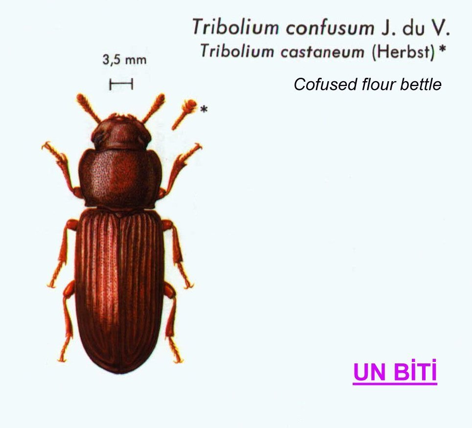 Tribolium ssp. Un, kepek, irmik, hububat, çikolata, baharat, kuru meyve ve baklagillerde zararlı türlerdir.
